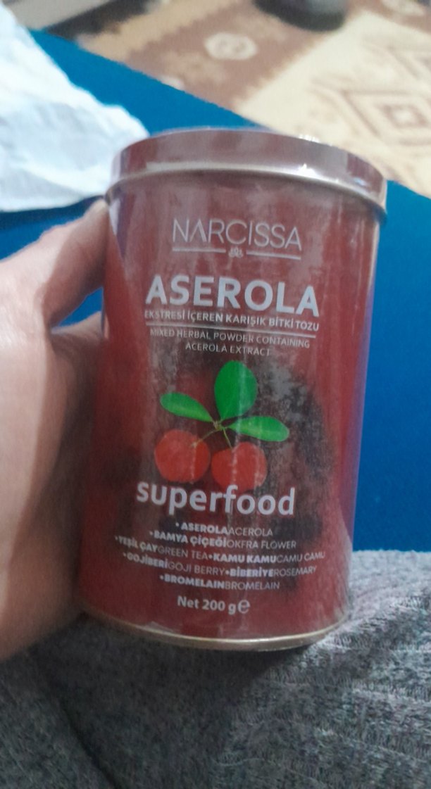 Narcissa acerola tozu, acerola ve çeşitli bitki özleri içerir. Parlak kırmızı ambalajda, 200 gram ağırlığındadır.
