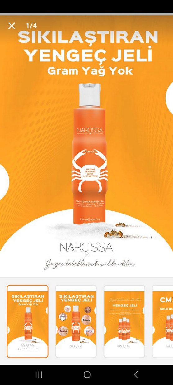 1 adet fiyatidir. 2 adet 300 olur Yengeç kabuğu özlü ve L-karnitinli Narcissa sıkılaştırıcı jel, cildi sıkılaştırır ve canlandırır, yağ içermez.