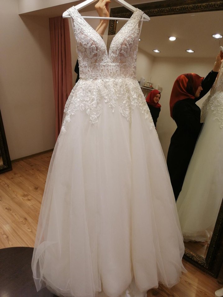 S/m uyumlu Beyaz A kesim gelinlik, işlemeli dantelli oturan üst kısmı ve derin V yaka detayıyla öne çıkar. Kolsuz ve uzun etekli, modern klasik ve vintage esintili bir tasarım sunar.