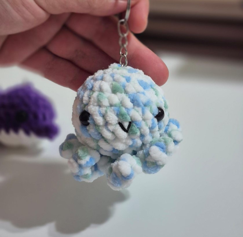 Narin pastel turkuaz renkte, kabarık dokulu, rahat peluş ahtapot şeklinde bohem tarzda anahtarlık.