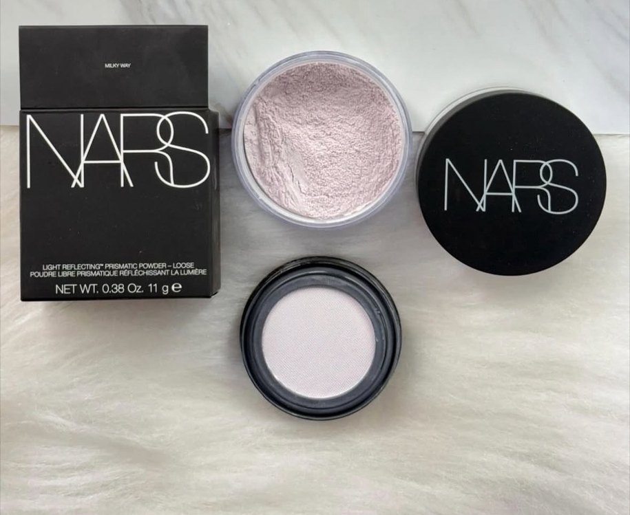 NARS açık ten rengi, ince dokulu, makyaj sabitlemek için kullanılan pudra. Siyah kapak ve ince elek içerir.