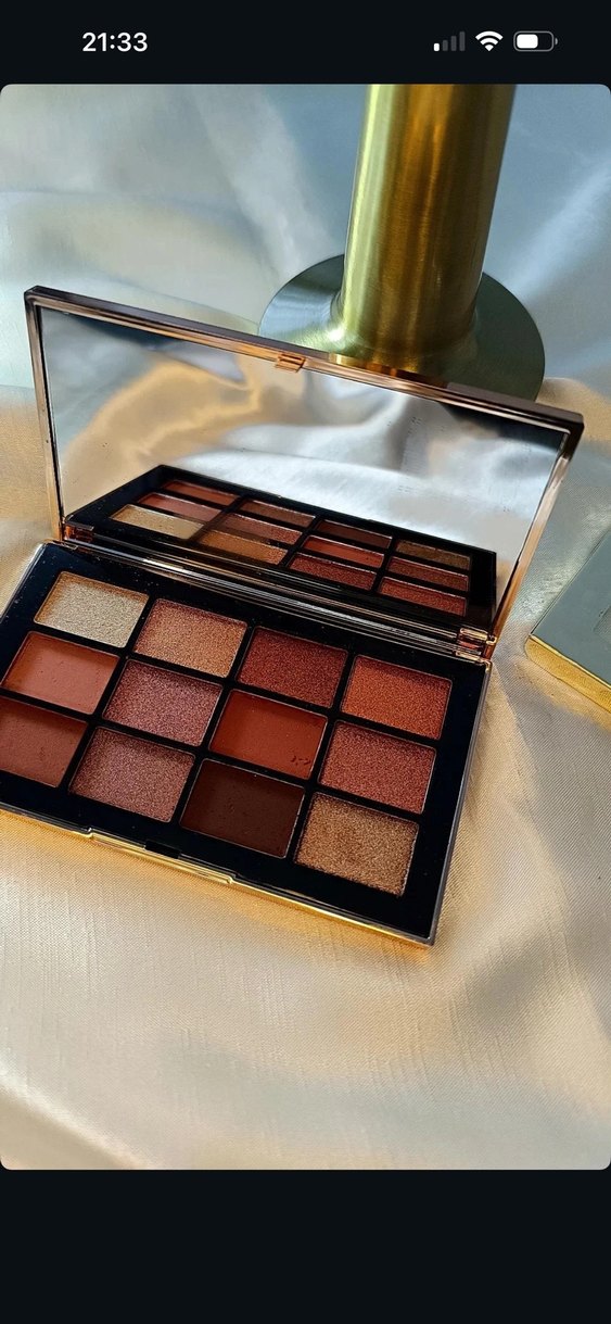 Koyu bej tonlarında, mat ve parlak dokularda farlar içeren palet. Uygulama için aynası bulunmaktadır.