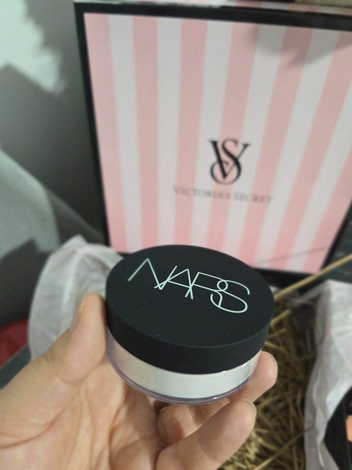 NARS bej renkli, siyah kapaklı küçük yuvarlak kutuda gevşek pudra. Pürüzsüz mat bir görünüm sağlar.