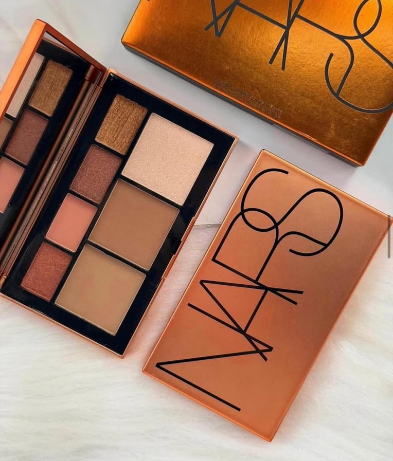 NARS göz farı paleti, mat ve ışıltılı bej ile koyu tonlar içerir. Kompakt kutuda ayna bulunur.