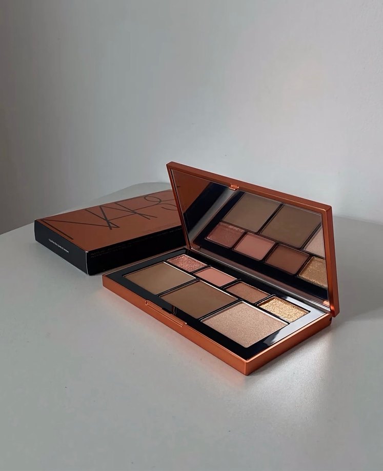 NARS göz farı paleti, mat ve ışıltılı karışık koyu bej tonları içerir. Uygulama için aynası mevcuttur.