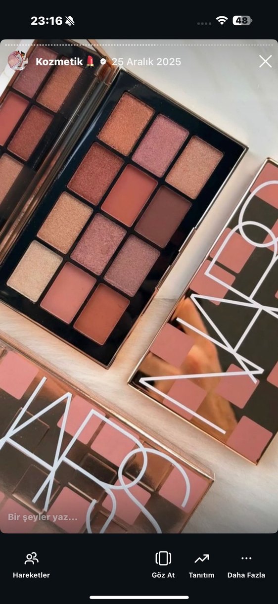 NARS göz farı paleti, mat ve ışıltılı bitişli koyu bej tonlarından oluşur. Çeşitli göz makyajları için uygundur.