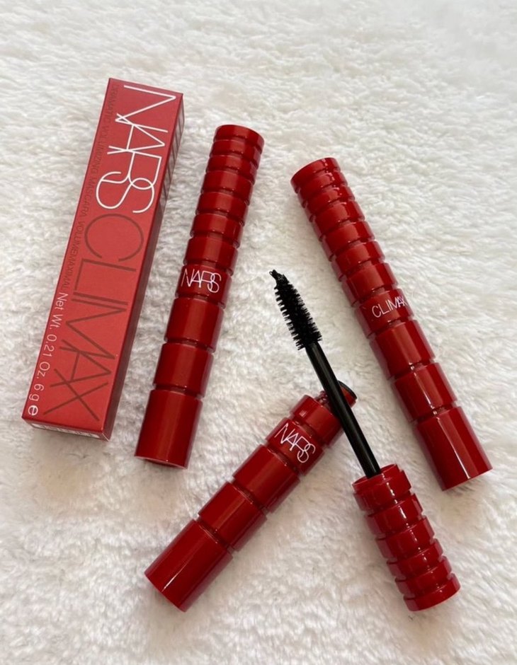 NARS kırmızı maskara, koyu ve canlı renkte, hassas uygulama için özel fırça ve 'A' harfi bulunan ambalaj ile.