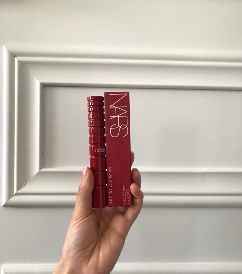 Koyu kırmızı renkte NARS maskara, kirpiklere yoğun renk ve hacim sağlar. Ambalajında 'A' harfi bulunur.