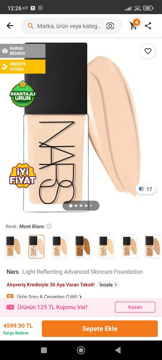 Nars Mont Blanc tonunda ışık yansıtan gelişmiş bakım özellikli fondöten, açık bej renkte ve parlak bir görünüm sağlar.