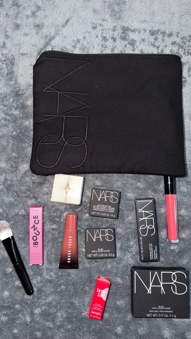 Fermuarlı siyah NARS makyaj çantası ve içinde ruj, allık, fırça gibi çeşitli makyaj ürünleri bulunur. Üzerinde NARS logosu vardır. AS, MS kodları mevcuttur.