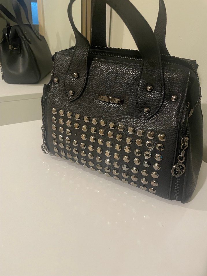 Siyah deri ve parlak baskılı perçinlerle süslenmiş, tokalı rock punk tarzı kadın çantası. Günlük kullanıma uygun cesur bir tasarım.