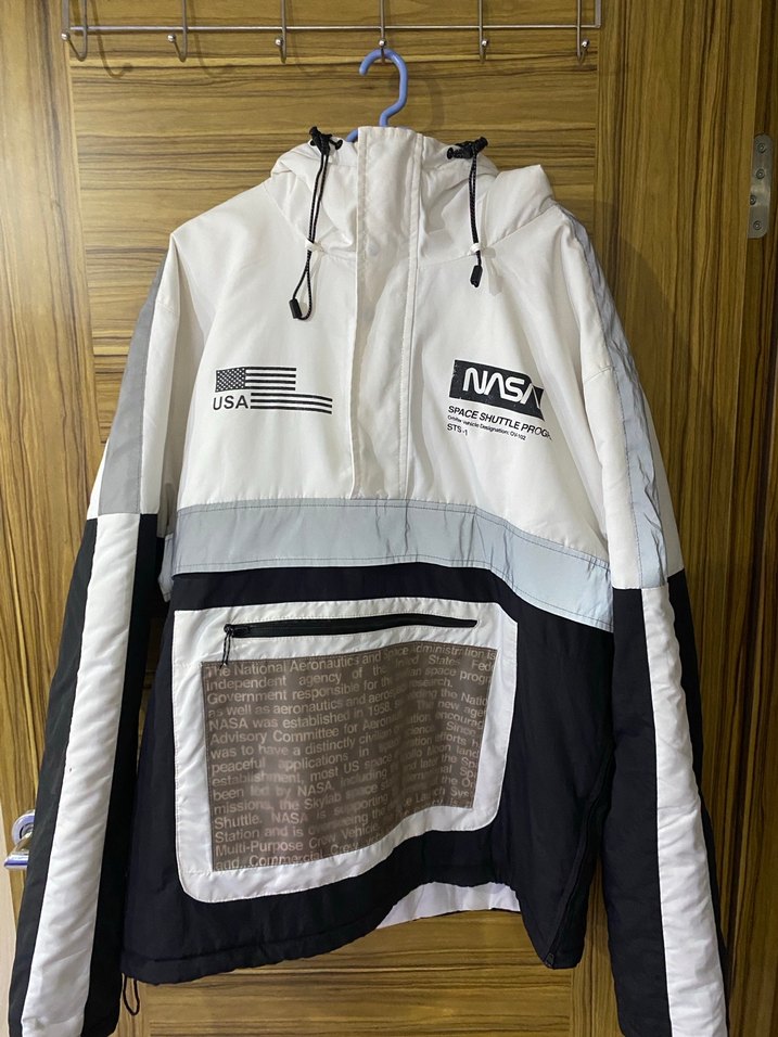 Geniş kesim, uzun kollu, fermuarlı Kadın Erkek mont Notlu yaka ve NASA baskılı, gri beyaz renklerde, dış mekan için uygun.
