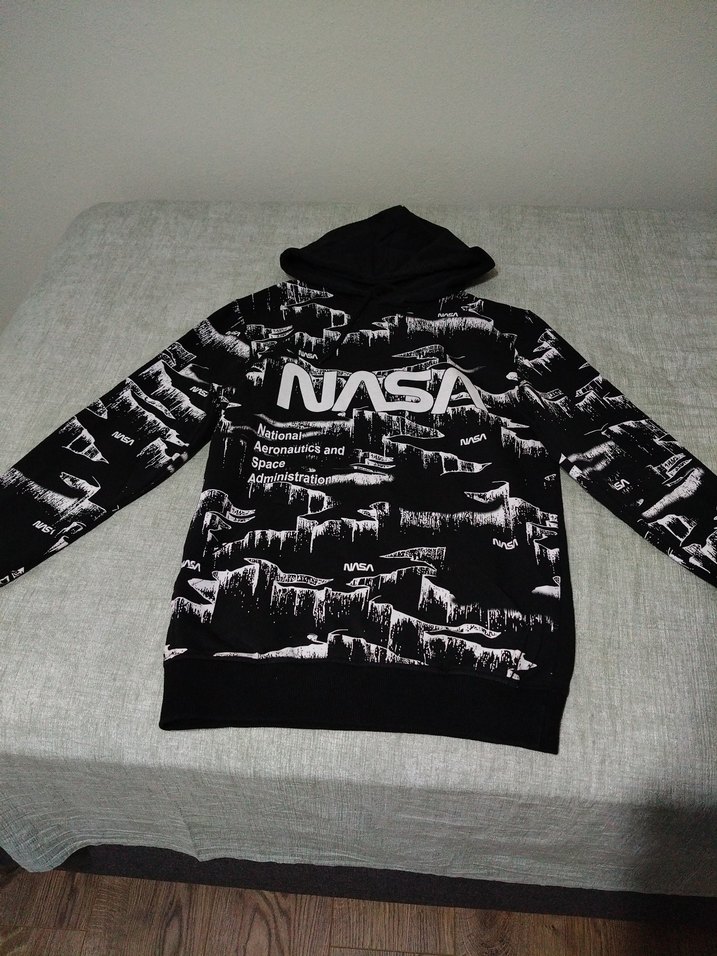 Siyah, kapüşonlu ve uzun kollu erkek sweatshirtü, rahat kesim ve yumuşak fleece kumaştan. NASA baskısı ile trend sokak stili sunar.