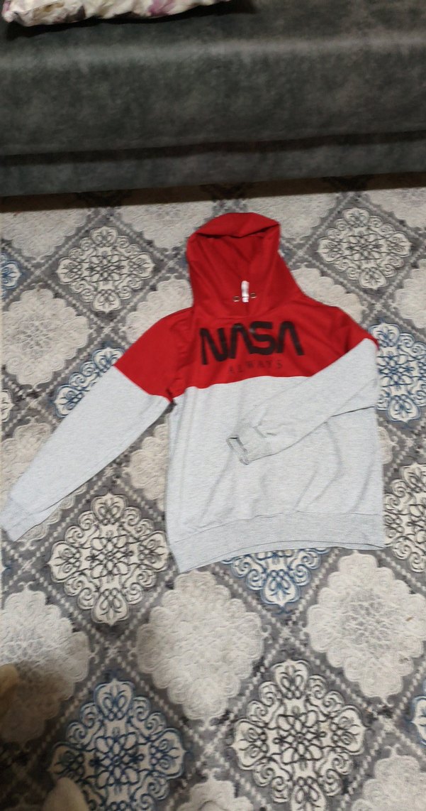 NASA baskılı kırmızı kapüşonlu ve gri kısımlı, uzun kollu, yuvarlak yaka, bol kesim, yumuşak ve sıcak kumaştan spor tarz sweatshirt.