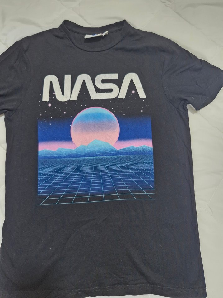 Siyah, bol kesim kadin tişörtü, NASA baskılı, yuvarlak yaka ve kısa kollu, sokak modasına uygun rock punk tarzında.