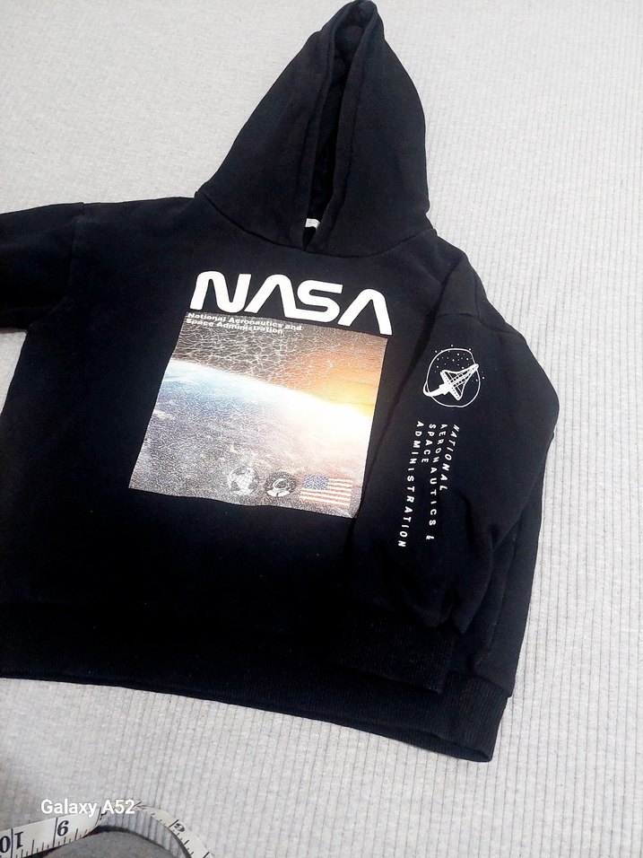 hm marks..NASA baskı kısmı biraz yıpranmş ama kullanıma engeli yok, uzun kollu ve bisiklet yaka. yumuşak ve sıcak kumaştan, bol kesim ve normal boyda.