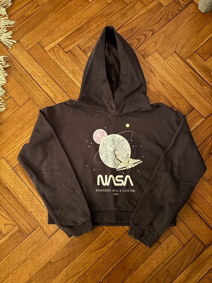 H&m 11-12 yaş kapüşonlu ve uzun kollu NASA baskılı sweatshirt. Yumuşak ve sıcak kumaştan, bol kesim ve fermuarlı detaylı, dış mekan kullanımı için uygun. Sorunsuzdur. #hm