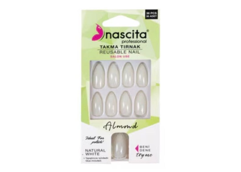 Nascita markasının beyaz renkli, badem şekilli 36 adet takma tırnağı. Profesyonel salon kullanımı için uygun, doğal görünümlü.