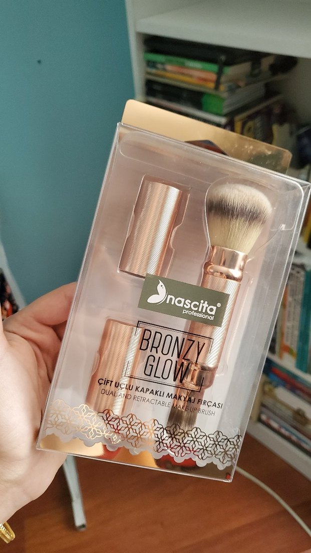 Nascita BRONZY GLOW makyaj fırçası, parlak altın renkli, çift uçlu ve kapaklı tasarımıyla kolay kullanım ve taşınabilirlik sağlar. ✨