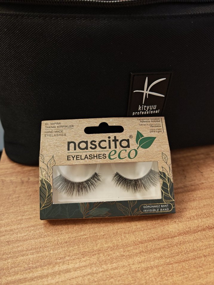 Görünmez bantlı Nascita Eco el yapımı takma kirpikler, doğal bir görünüm için koyu bej renkte hacim ve uzunluk sağlar.