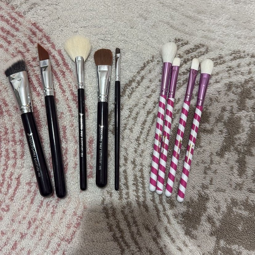 Farklı boyut ve şekillerde, pembe ve siyah saplı makyaj fırçalarından oluşan set. Çizgili ve düz saplar kolay tutuş sağlar. ️