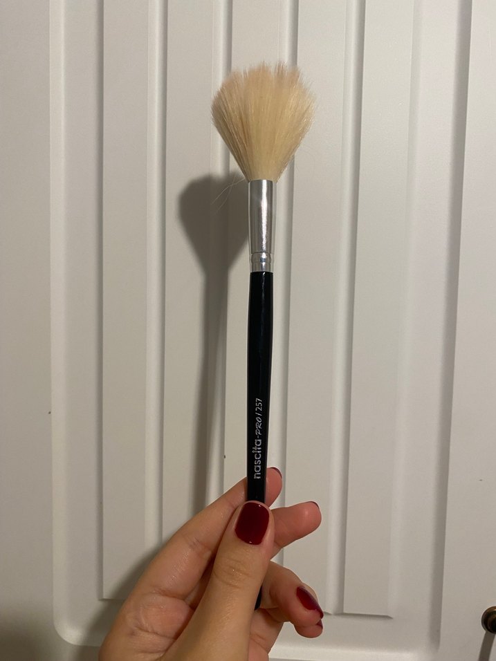 Yumuşak, açık bej kıllara ve siyah saplı makyaj fırçası, pürüzsüz uygulama sağlar. ️