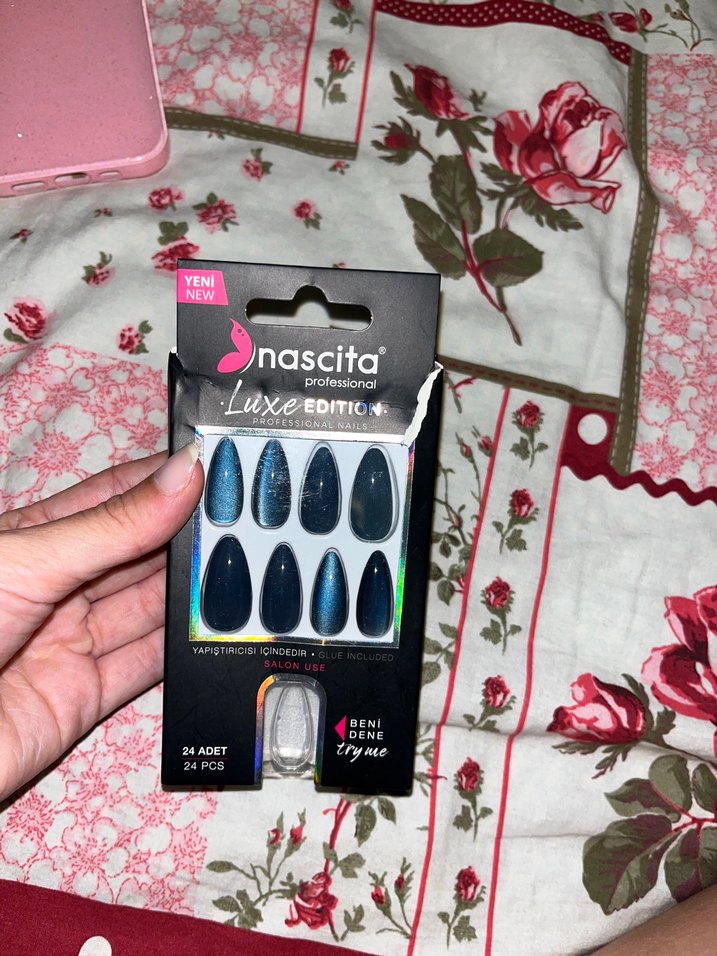 Nascita Luxe Edition koyu mavi tırnak süslemeleri, kolay yapıştırma için yapıştırıcı ile birlikte. 24 parça set. bir kere takıldı
