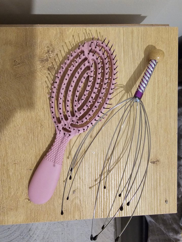 Esnek kıllara sahip pembe saç fırçası ve ahşap saplı metal baş masaj aleti içeren set. ♀️