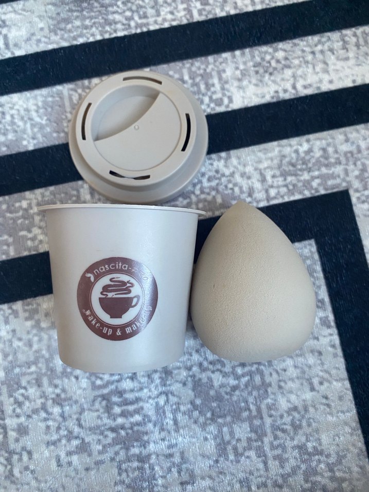 Bej makyaj süngeri ve gri saklama kutusuyla pratik ve hijyenik kullanım sağlar.