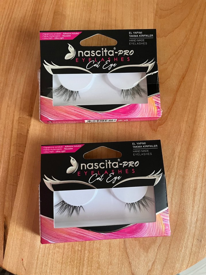 Nascita-Pro marka, el yapımı, koyu renklerde kedi gözü tarzında sahte kirpikler. Canlı pembe detaylı ambalajda, yapıştırıcı dahil. 2 Adet fiyatıdır