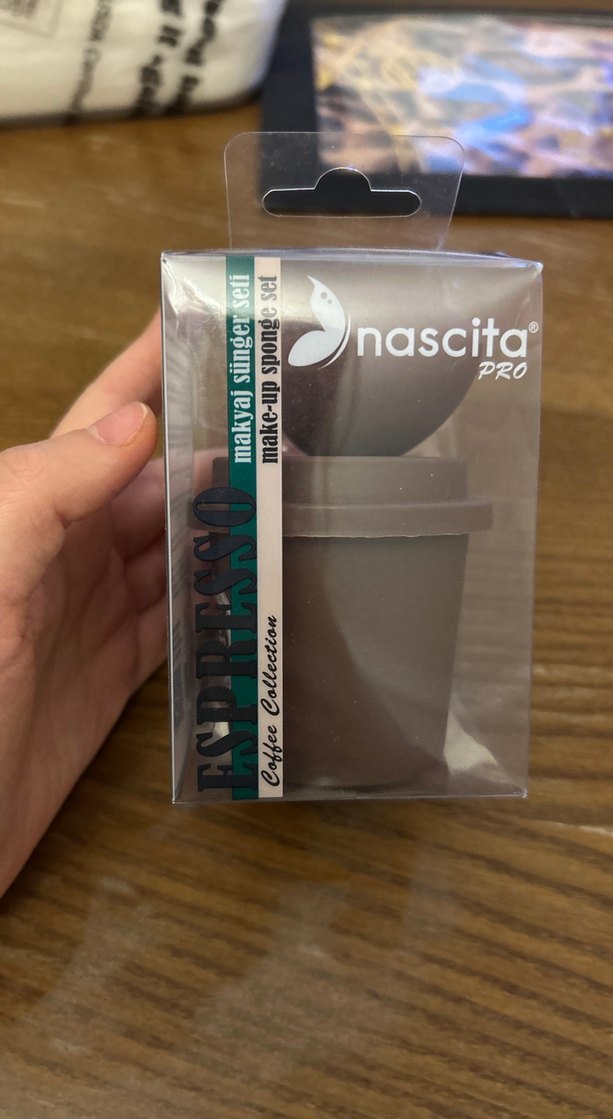 Bej ve gri renklerde Nascita Pro Espresso makyaj süngeri seti, kullanım ve hijyen için saklama kabı içerir. ☕