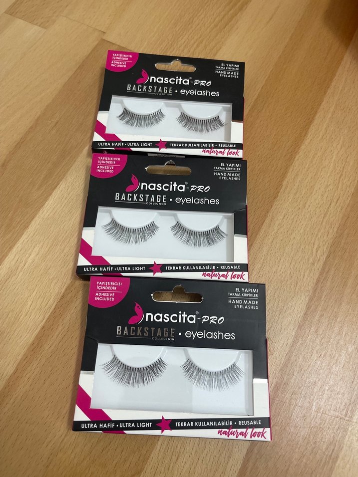 Nascita Pro ultra hafif, bej renk takma kirpikler, doğal görünüm için el yapımı ve tekrar kullanılabilir. Parlak bitiş gözleri vurgular.