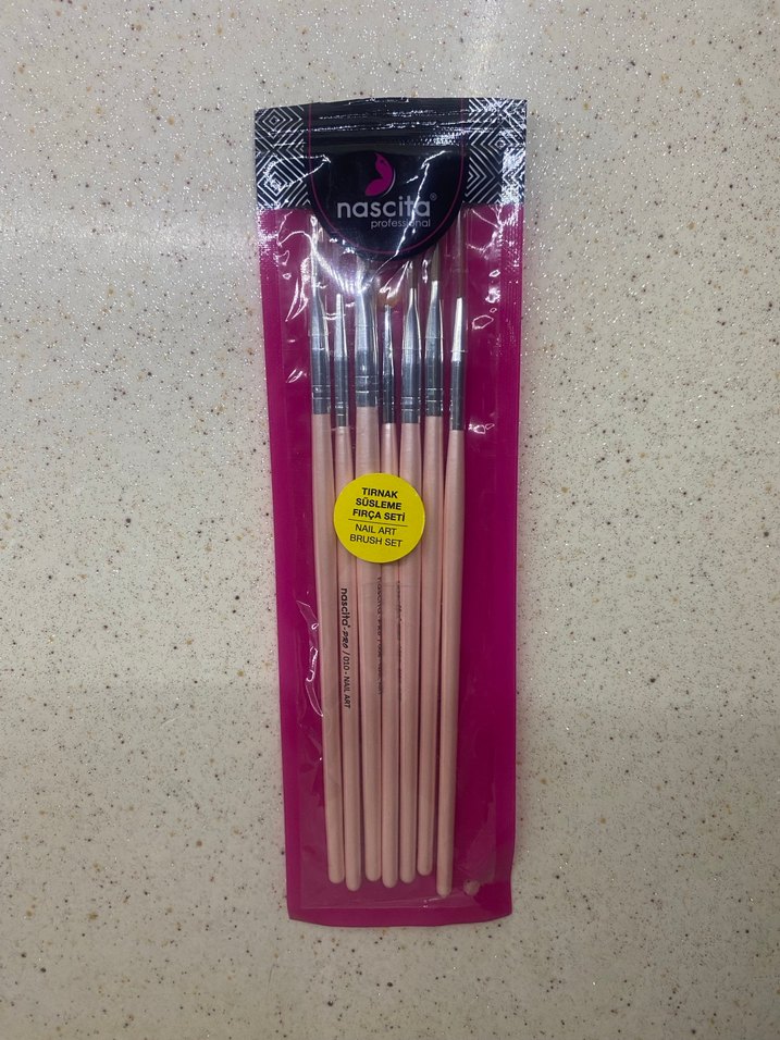 Pastel pembe renkte, tırnak süsleme ve nailart için tasarlanmış fırça seti. Her fırça farklı nailart süsleme modelleri için hassas kullanım sağlar. Hiç kullanılmadı, sıfır.
