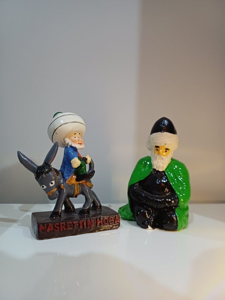 Nasrettin Hoca figürin seti, biri eşek üzerinde diğeri oturur pozisyonda, koyu yeşil tonlarda detaylı ifadelerle tasarlanmıştır.