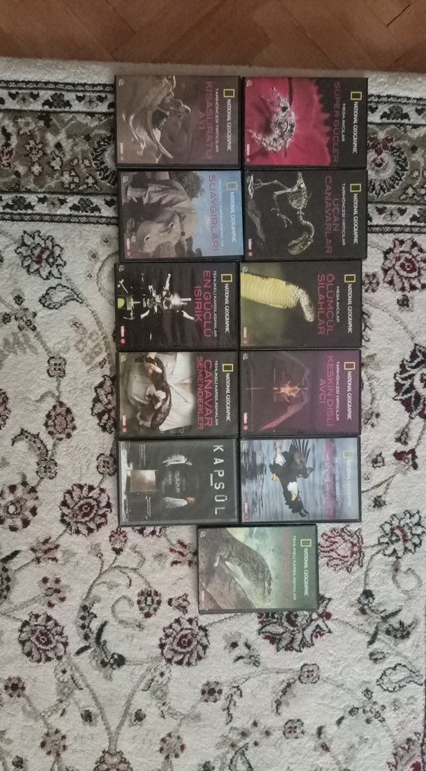 National Geographic belgesel DVD seti, dinozorlar, köpekbalıkları ve antik canlılar gibi konuları içerir. Eğitim amaçlı ve görsel olarak etkileyici.