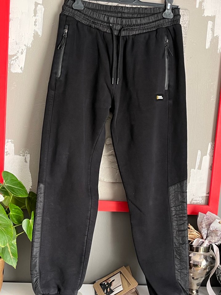 Erkek siyah outdoor eşofman, bol kesim ve fermuarlı ceplerle. Yumuşak ve sıcak kumaştan, spor ve gündelik sokak tarzı için uygundur.