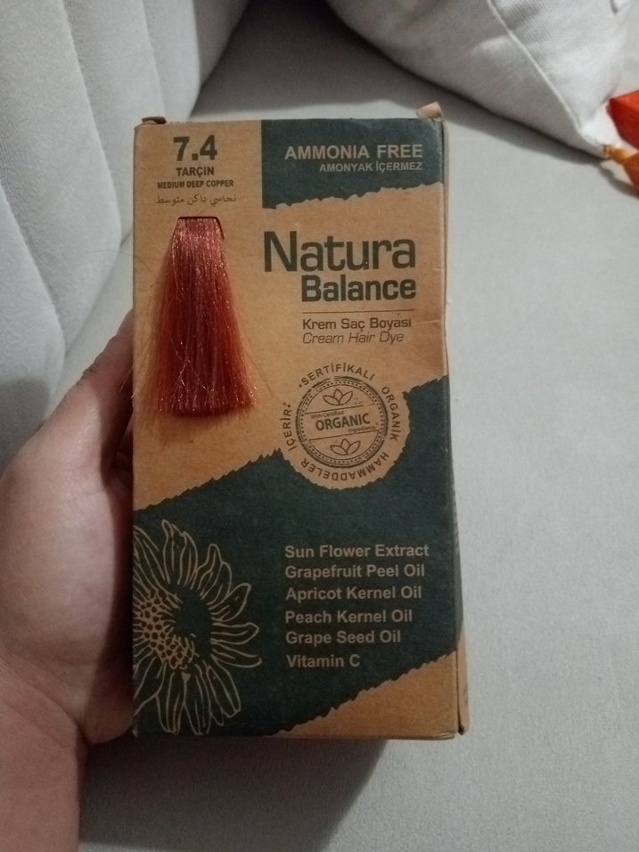 Natura Balance 7.4 tarçın krem saç boyası amonyaksızdır ve organik ayçiçeği ekstresi, greyfurt kabuğu yağı, kayısı çekirdeği yağı, şeftali çekirdeği yağı, üzüm çekirdeği yağı ile vitamin C içerir.