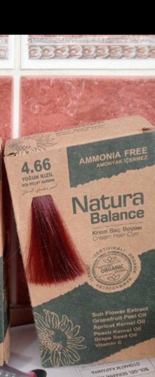 Natura Balance krem saç boyası 4.66 yoğun kızıl tonu, amonyak içermez ve sertifikalı organiktir.