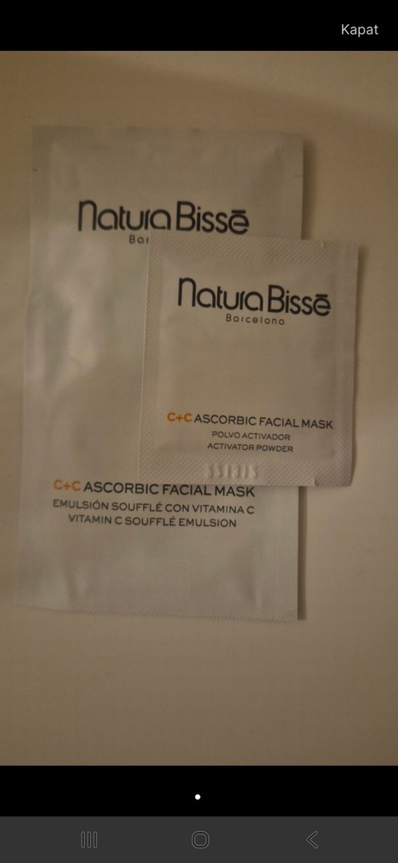 Natura Bissé C+C Askorbik Yüz Maskesi, aktivatör tozu ve C vitamini soufflé emülsiyonu içerir.