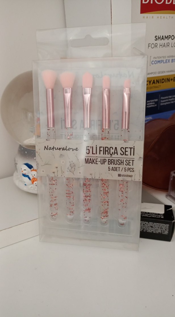 Naturalove markasına ait açık pembe saplı, yumuşak kıllı 5'li makyaj fırça seti. Farklı makyaj uygulamaları için çeşitli fırçalar içerir.
