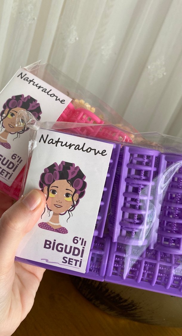 Naturalove markasına ait, saç şekillendirmek için kullanılan 6'lı pembe bigudi seti. Hafif ve kullanımı kolaydır. İki paket şeklinde satılıktır.