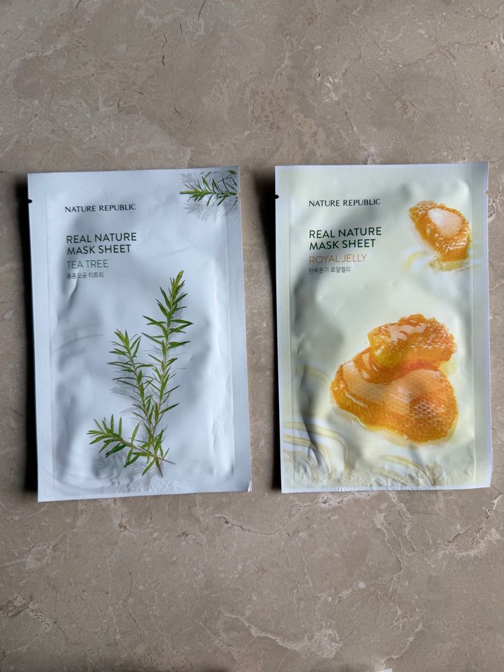 Nature Republic'in çay ağacı ve kraliyet jölesi özlü maske yaprakları cildi yatıştırır ve besler.