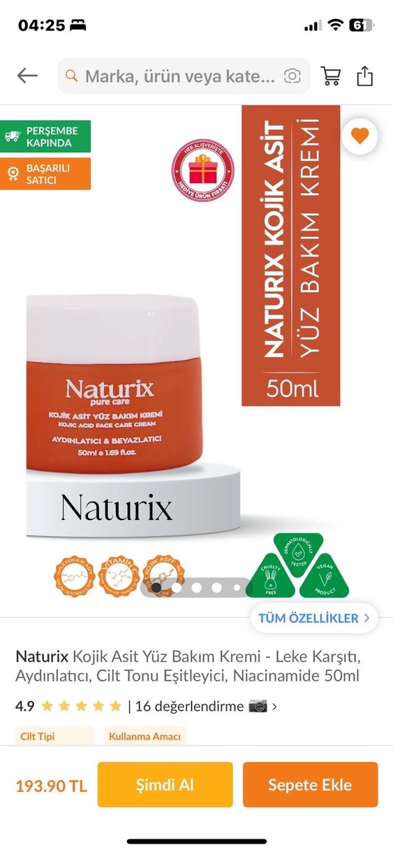 Naturix Kojik Asit yüz kremi, cilt tonunu eşitler, aydınlatır ve leke karşıtı etki sağlar. 50ml boyutundadır.