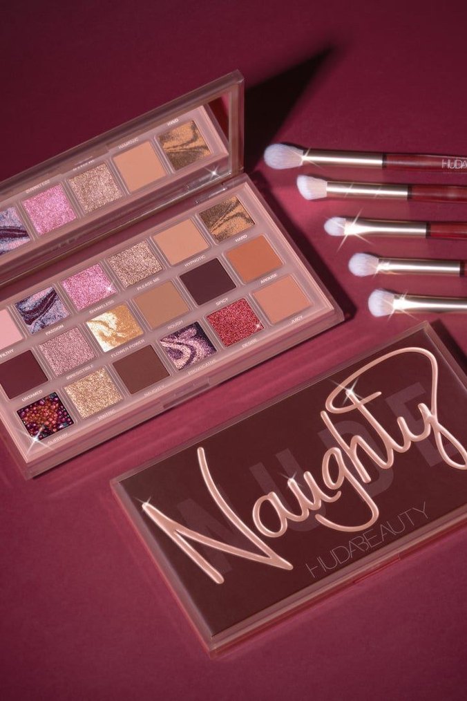 Huda Beauty'nin Naughty far paleti, bordo ve parlak tonlar içerir.