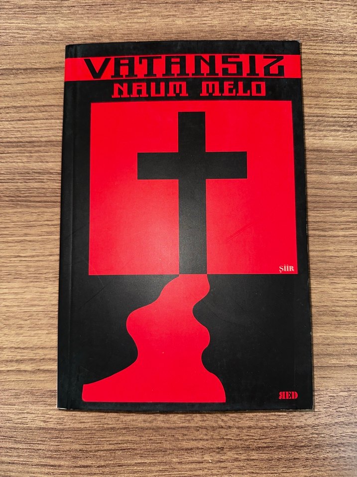 Naum Melo'nun 'Vatansız' adlı kitabı, üzerinde haç ve soyut bir tasarım bulunan kırmızı-siyah kapaklı dini içerikli bir yayındır.