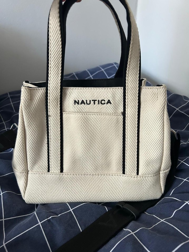 Nautica marka, bej sentetik kumaştan, fermuarlı günlük kullanıma uygun minimalist sokak tarzı kadın çanta.