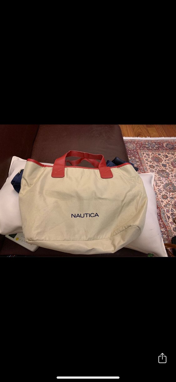 Nautica markalı, açık renk sentetik kumaştan yapılmış, tokalı ve baskılı detaylı kadın günlük çantası.