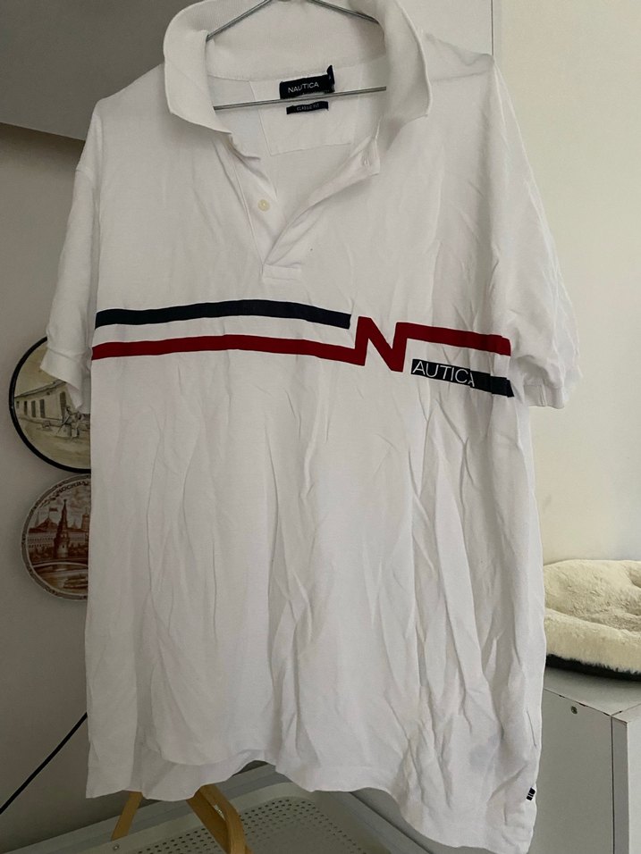 Nautica markalı beyaz pamuklu erkek polo tişört, kısa kollu, yakalı ve düğmeli. Göğüste çizgili sade desen bulunur, rahat kesimdir.