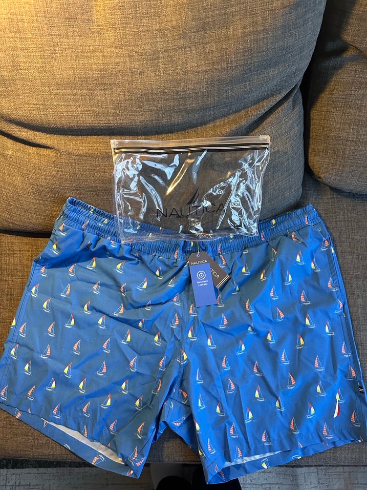 Nautica markalı sıfır etiketi üzerinde mavi deniz şortu. Sorunsuz/Sıfır ürün. XL bedendir etiketinde belirttiği üzere quick dry/hızlı kurur. Yeni sahibi güzel günlerde kullansın
