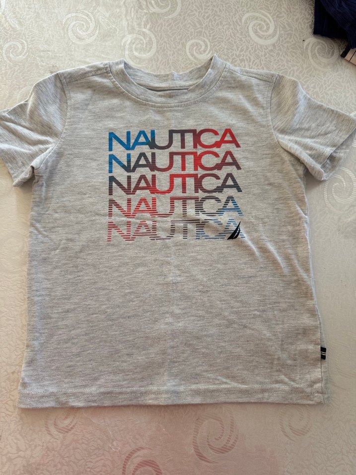 Gri renkli, kısa kollu ve bisiklet yaka erkek tişörtü. Üzerinde çok renkli "NAUTICA" baskısı bulunur. Yumuşak sentetik kumaştan üretilmiştir. Yurtdisinda alindi